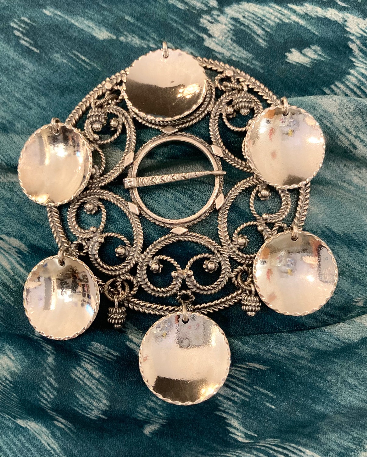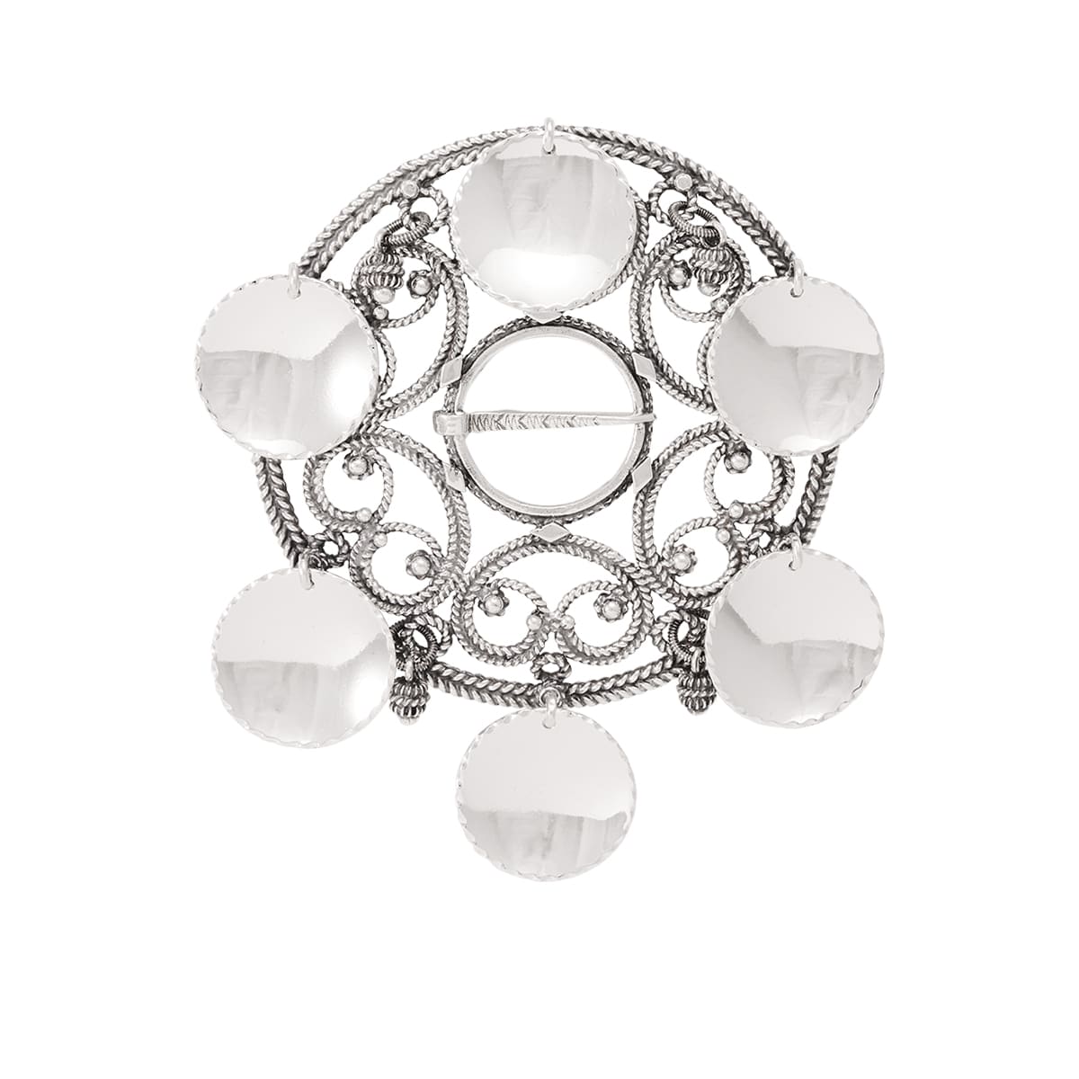 Denne rosesølja er litt større enn de andre rosesøljene våre, men med de samme fine detaljene. Den har fire dinglende kruse-duller og de store løva med filt kant er støpte. Dette gjør at de får et litt røffere utrykk. Men allikevel har den dette luftige ved seg som kjennetegner Huldreverkets rosesøljer. Passer til nesten alle bunader og stakker. Den finnes også med forgylte løv og kruse-duller.